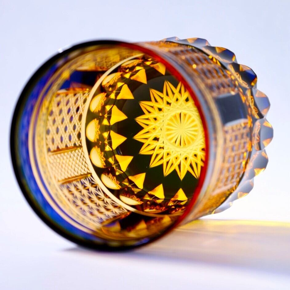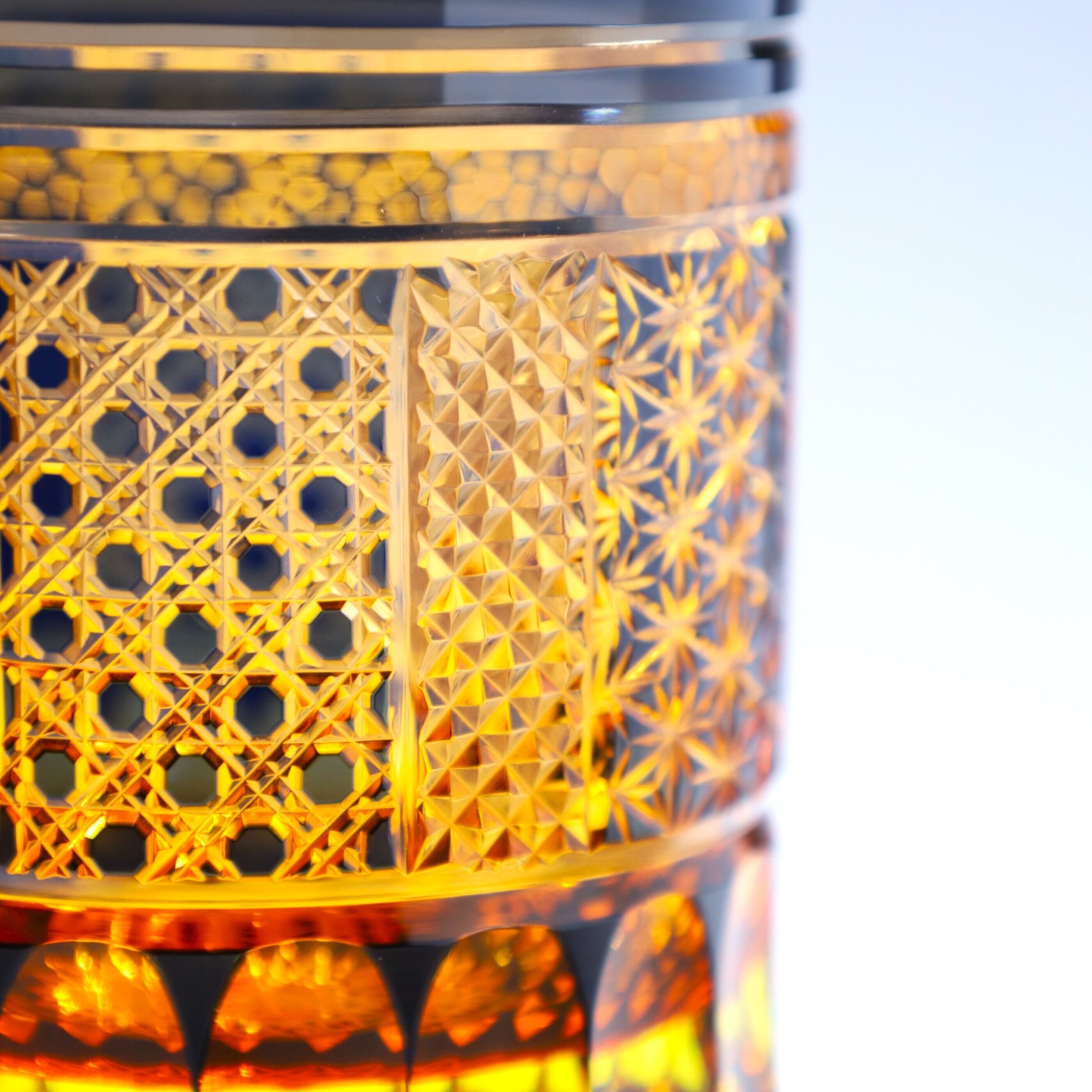 燈々無尽(とうとうむじん)とは、尽きることの無い燈火のように、お教えや想いが世代を超えて受け継がれていくーーそんな意味を持つ言葉です。明かりを灯す行燈(あんどん)をイメージしたデザインで、灯を繋ぐように、このグラスも親から子へ、世代を超えて使い続けていただきたいという願いを込めて制作しています。伝統文様「菊繋ぎ」「八角籠目」「魚子」「糸麻の葉紋」「芯あり蜘蛛の巣紋」を施し、様々な角度からグラスの表情を楽しんで頂けます。静かな夜に柔らかなオレンジが空間を照らし、穏やかなひと時を演出します。