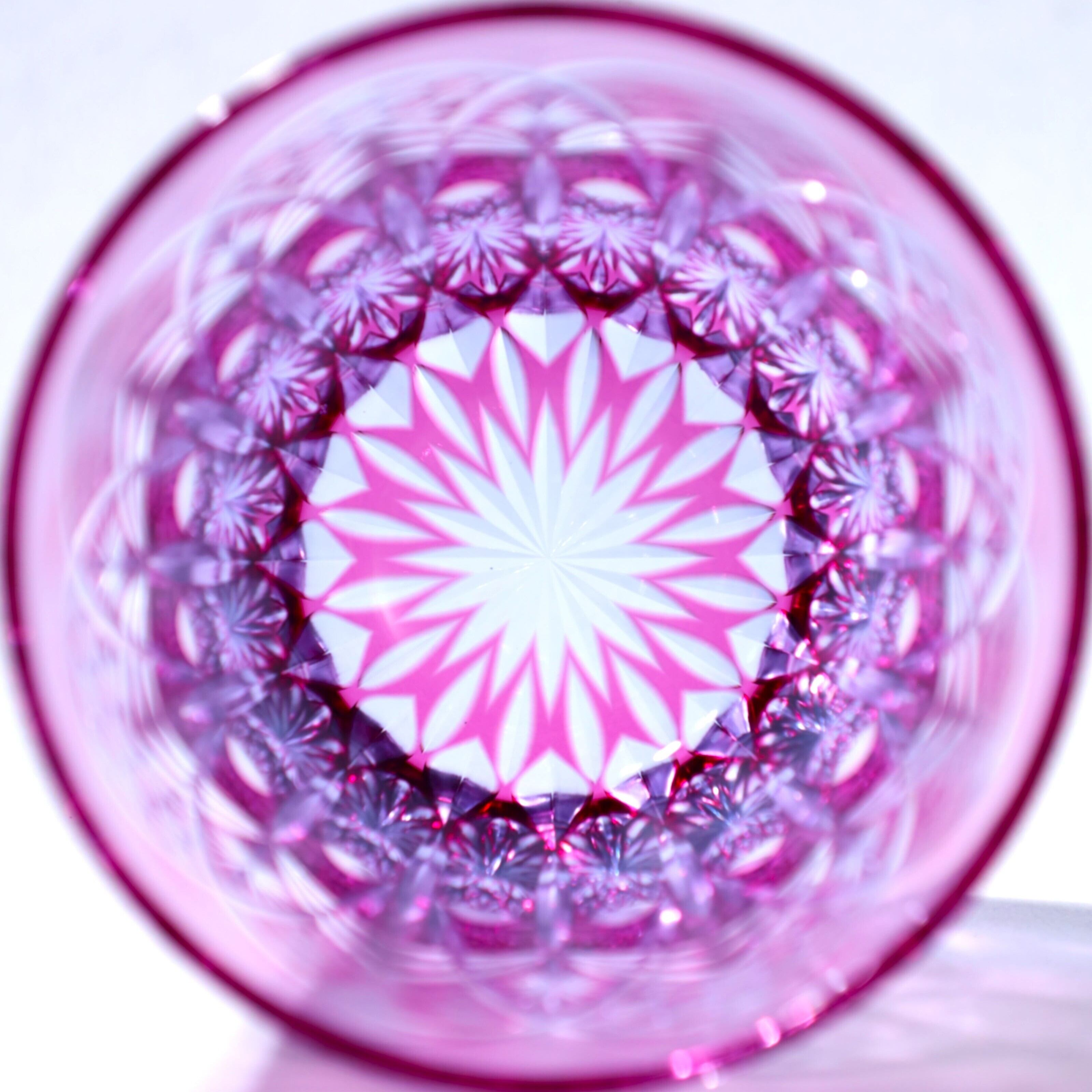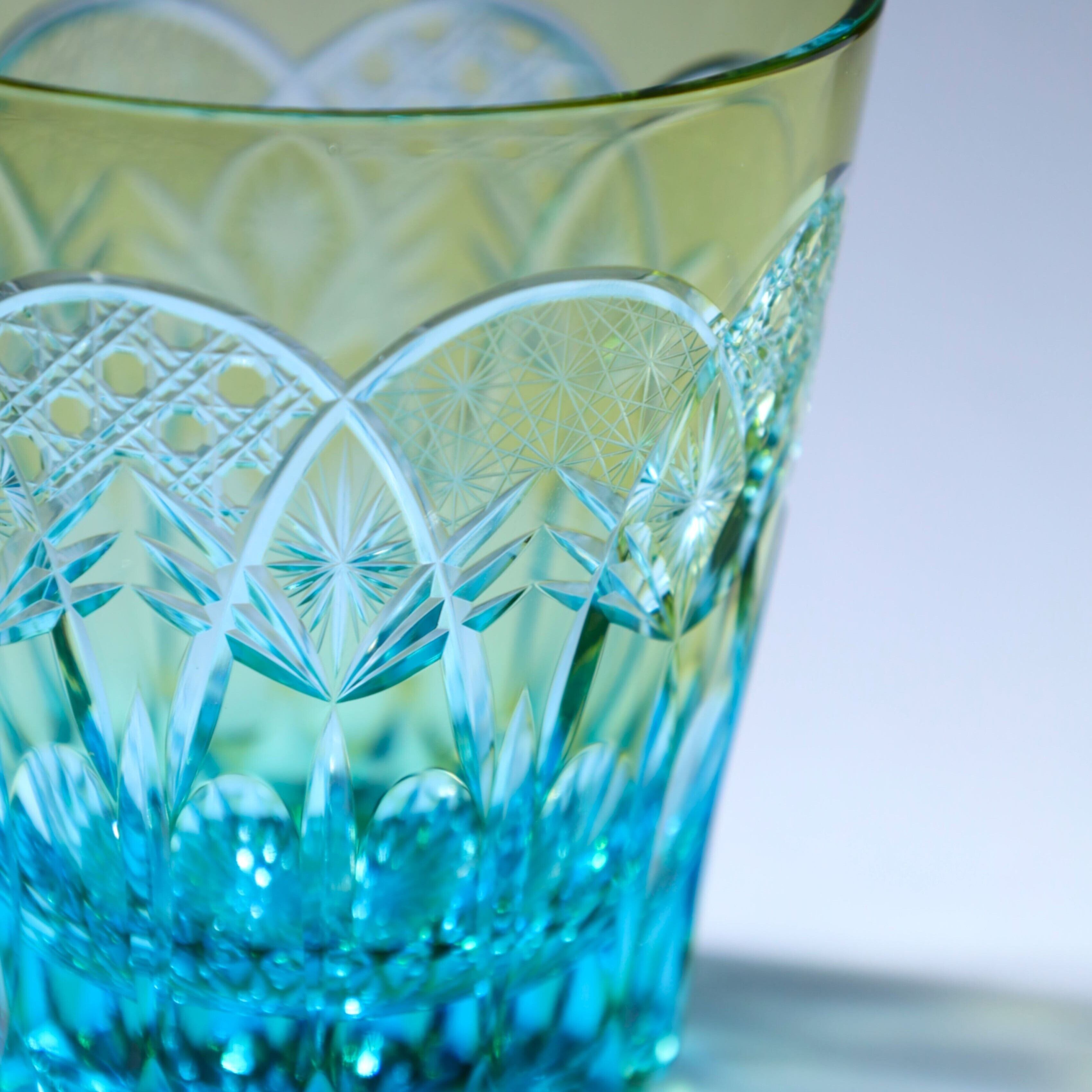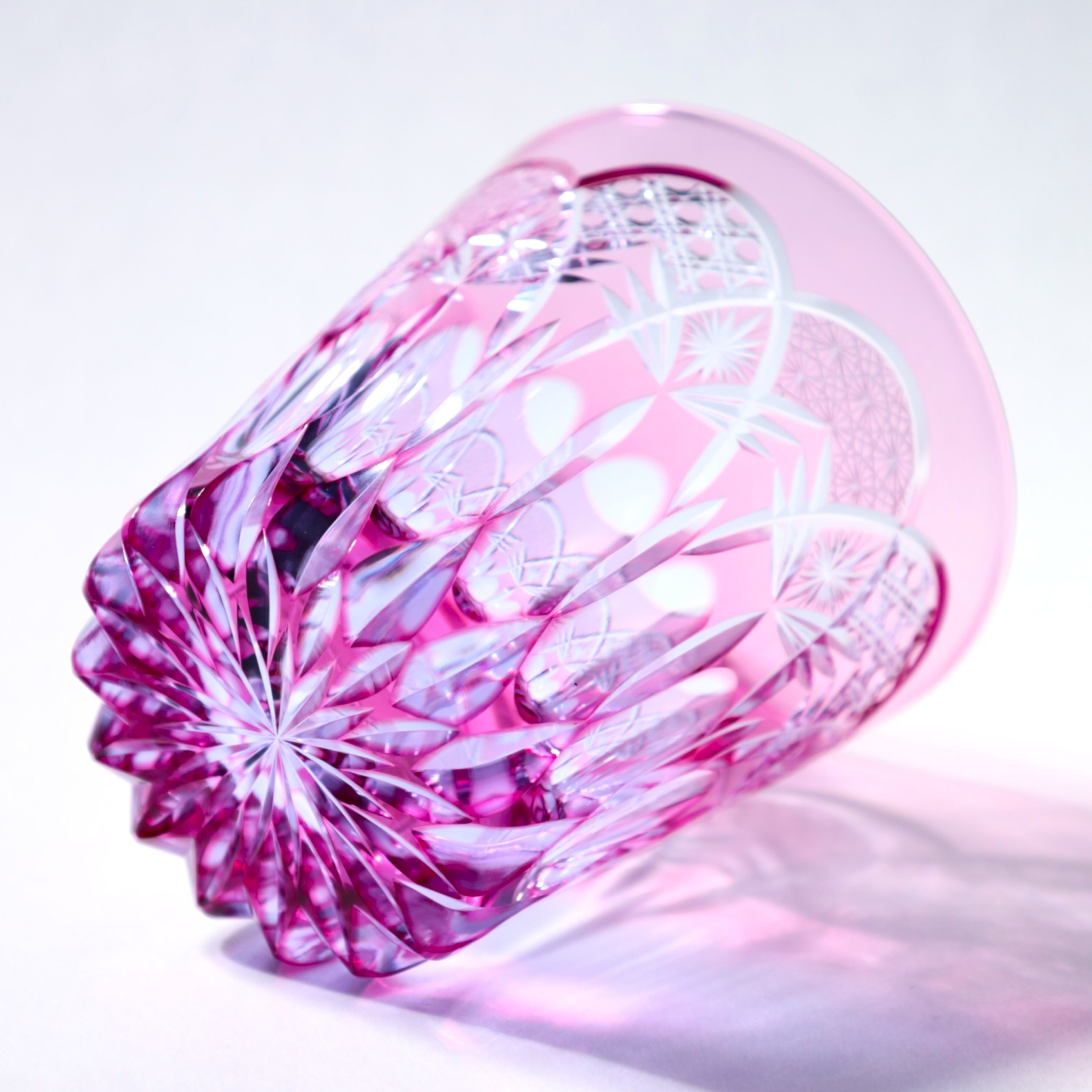ステンドグラスが美しいパリの歴史ある建造物に、インスパイアを受け製作しました。鮮やかなパステルカラーに光を透過することで生まれる柔らかな影が、空間に彩りを添えます。底部のカットは万華鏡のように側面に映り込み、上から覗くと幻想的な世界が拡がります。伝統文様の「菊繋ぎ」や「八角籠目」を施し、繁栄や魔除けの意味を込めています。水やお茶、冷酒・ウィスキー・ワインなど幅広く楽しんでいただけます。大切な方への贈り物としても、永く愛されるお品です。
