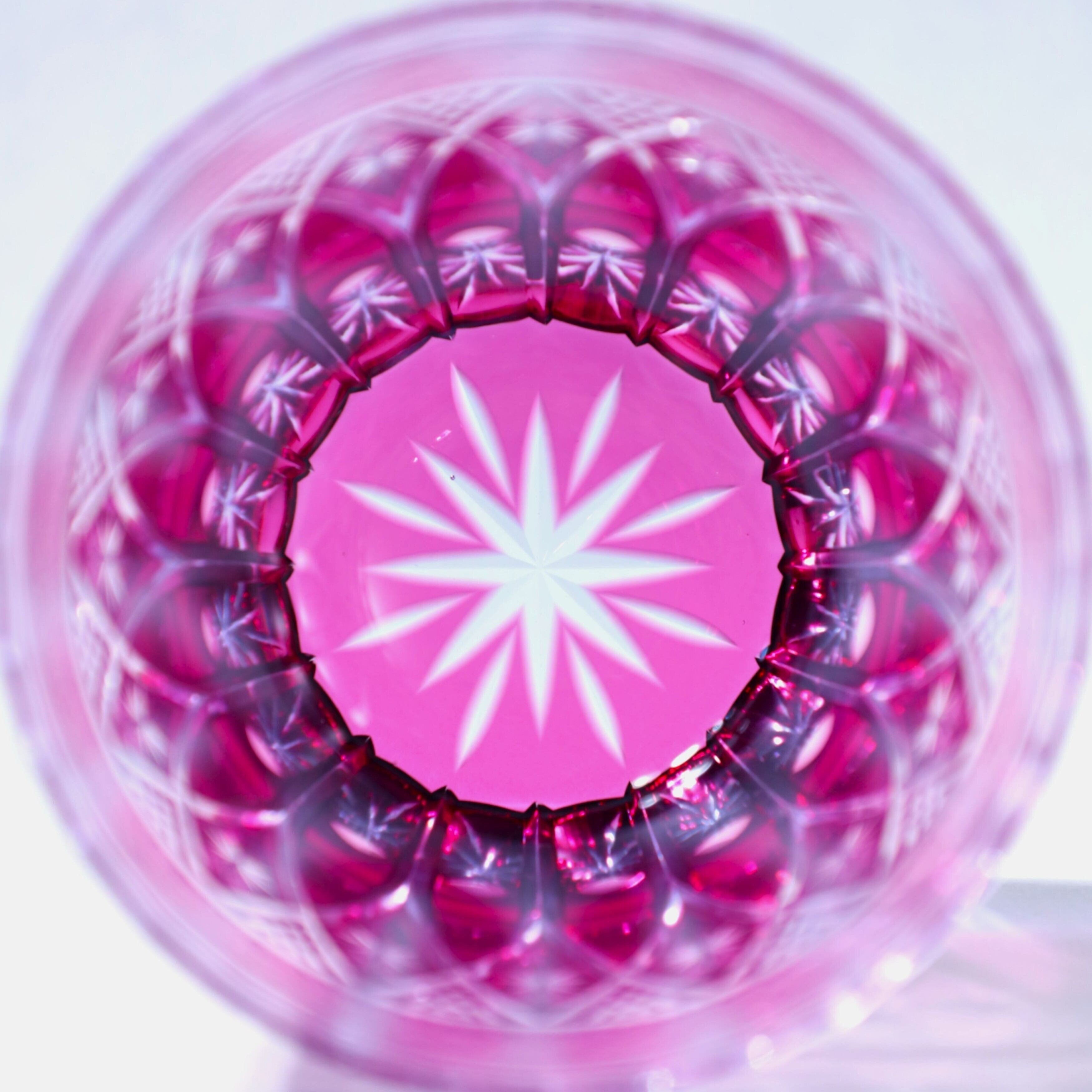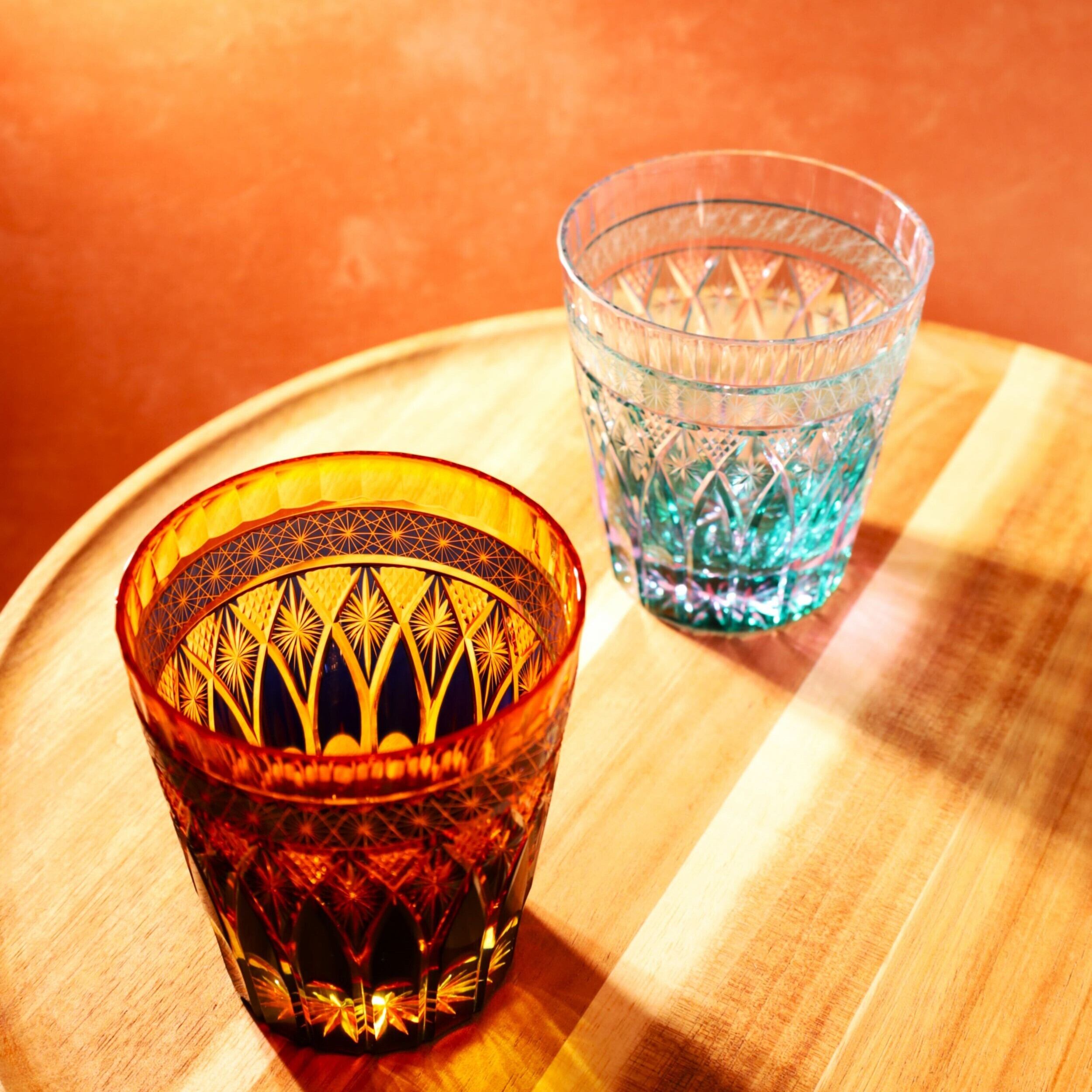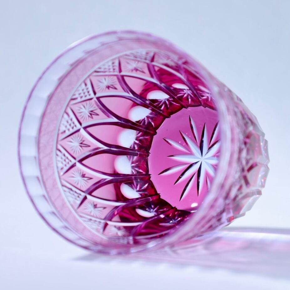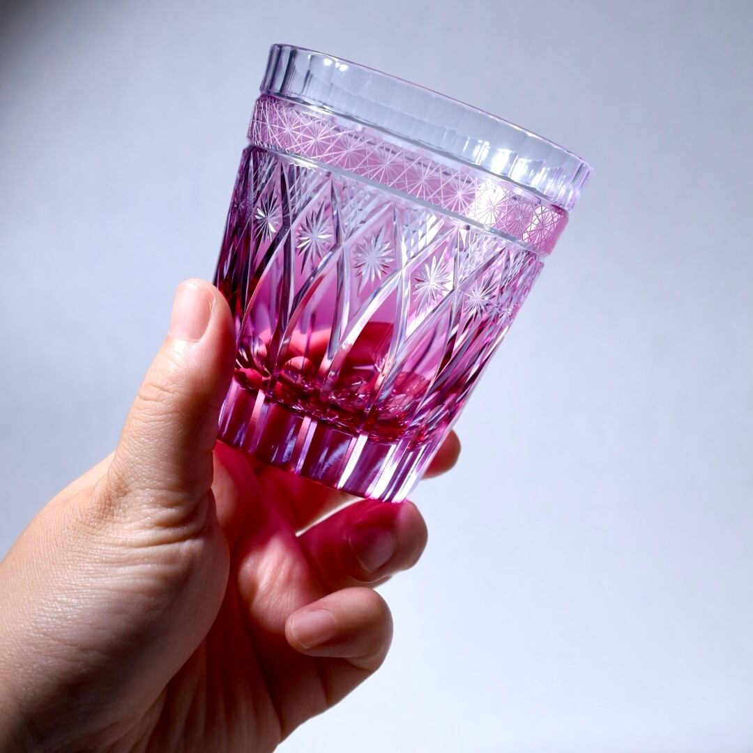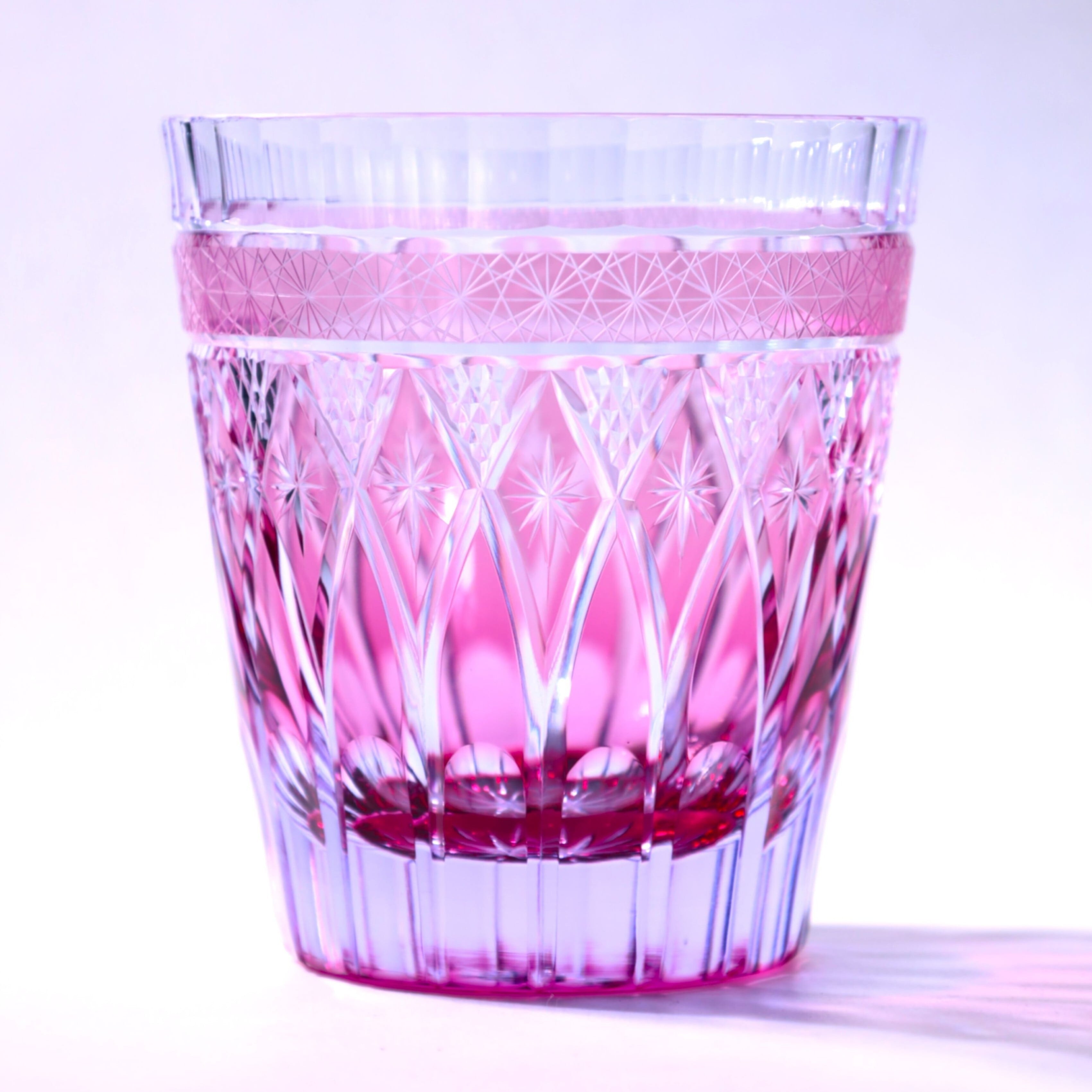 バロック建築の豪華絢爛な世界観にインスピレーションを得て製作しました。繊細で優雅な装飾をグラスに刻みました。柔らかなピンクとラベンダーのグラデーションは、心にほっとする癒しを。ゆっくりとした時を過ごす夜にも、爽やかな朝にもそっと寄り添います。伝統文様の「菊繋ぎ」や「魚子」を施し、繁栄やご縁、豊穣の意味を込めています。