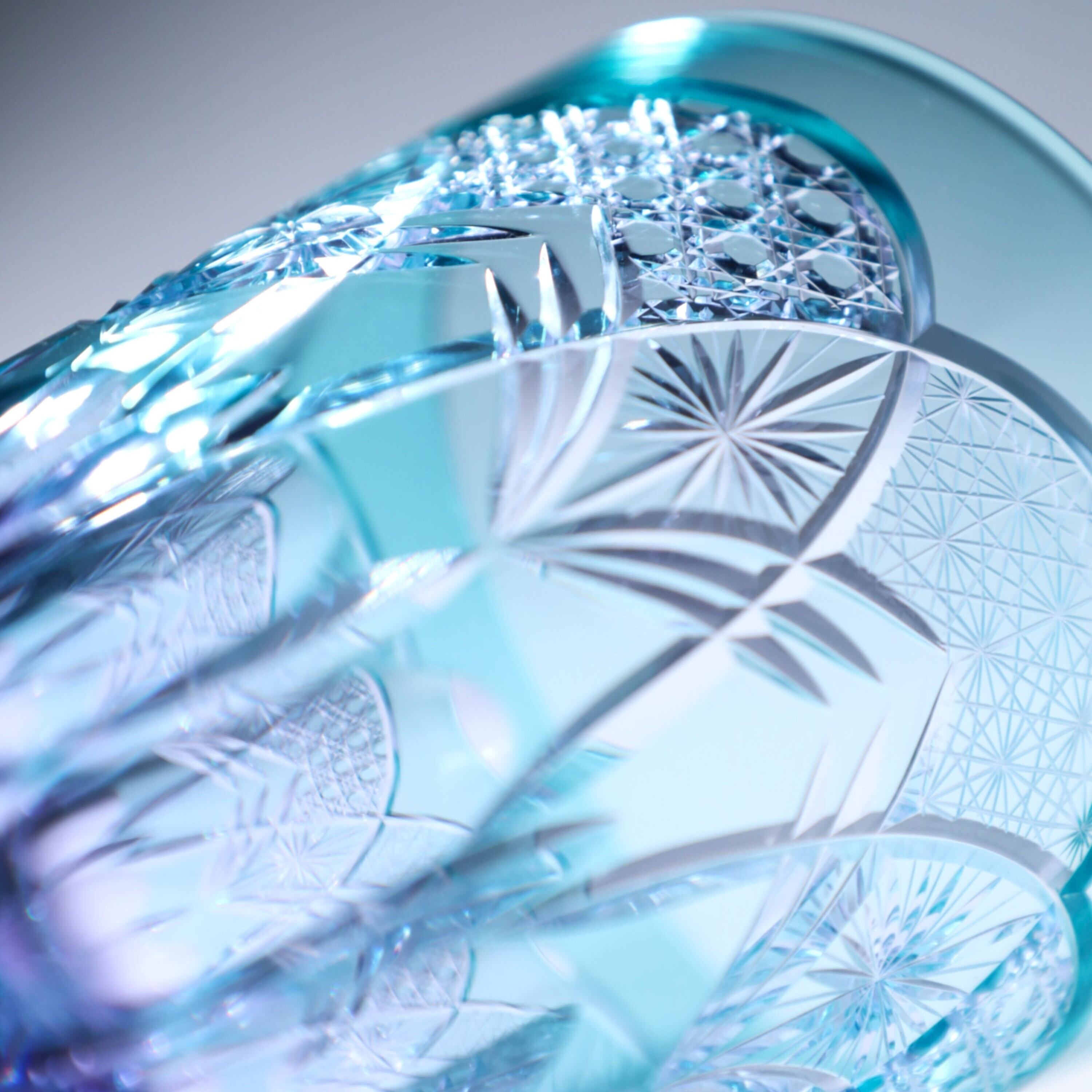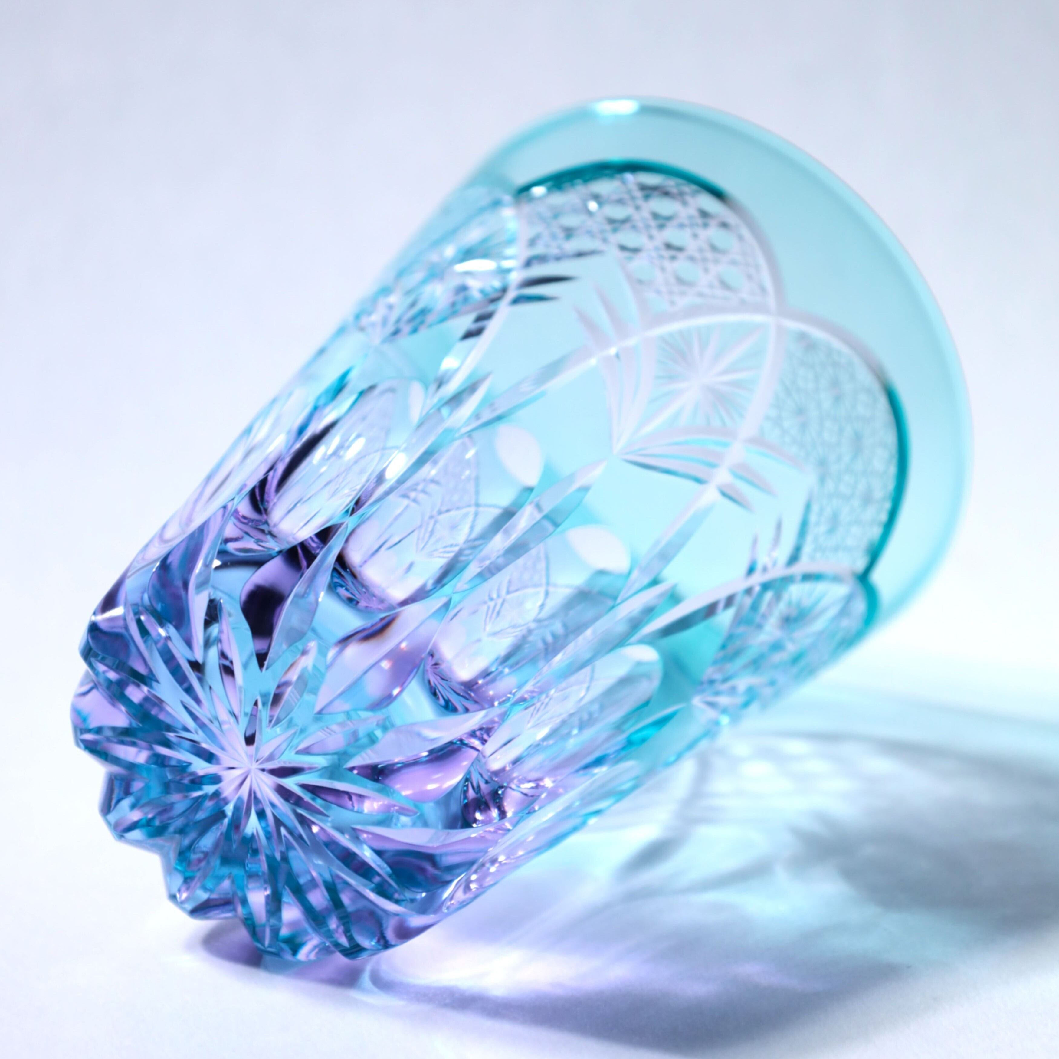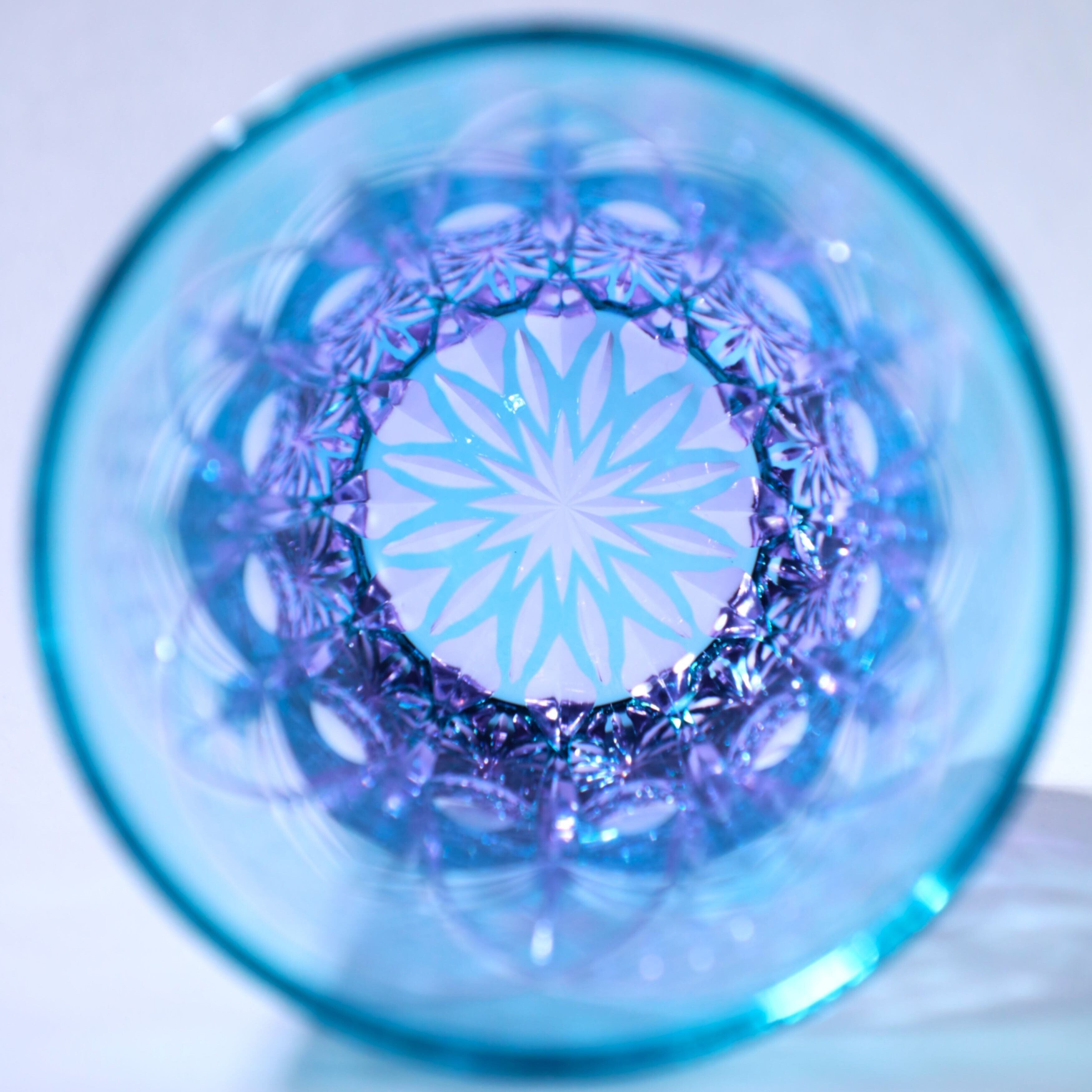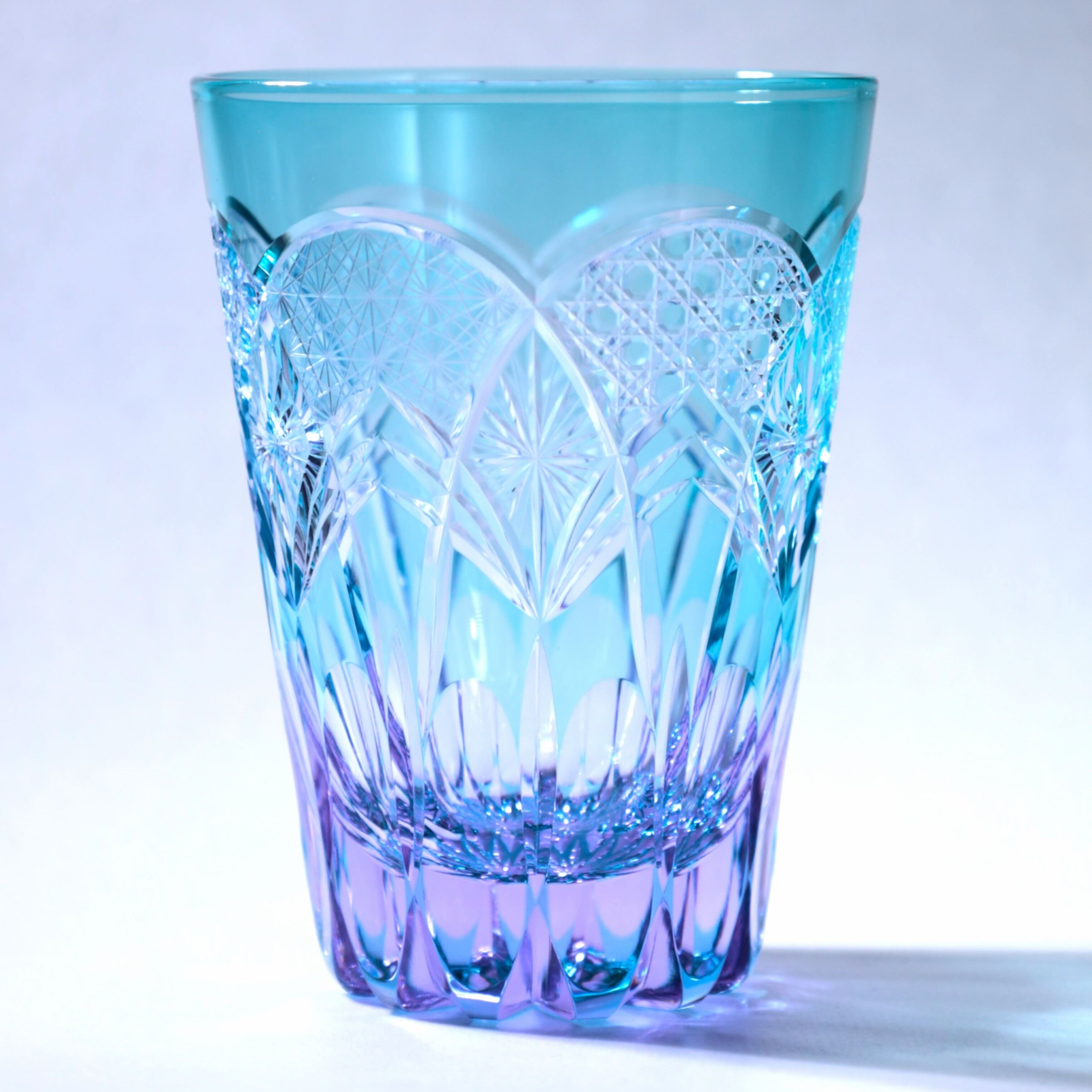 ステンドグラスが美しいパリの歴史ある建造物に、インスパイアを受け製作しました。鮮やかなパステルカラーに光を透過することで生まれる柔らかな影が、空間に彩りを添えます。底部のカットは万華鏡のように側面に映り込み、上から覗くと幻想的な世界が拡がります。伝統文様の「菊繋ぎ」や「八角籠目」を施し、繁栄や魔除けの意味を込めています。水やお茶、冷酒・ワイン・ビールなど幅広く楽しんでいただけます。大切な方への贈り物としても、永く愛されるお品です。