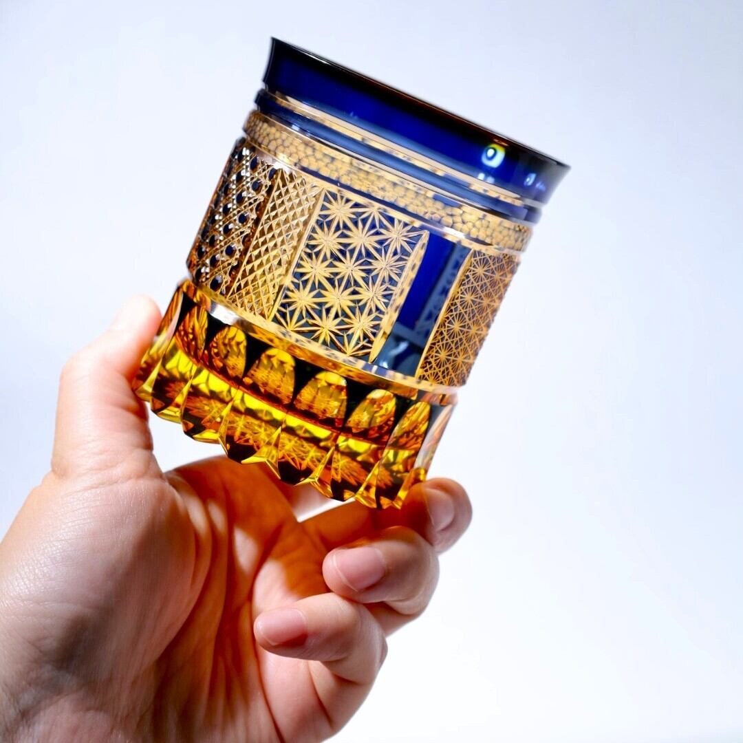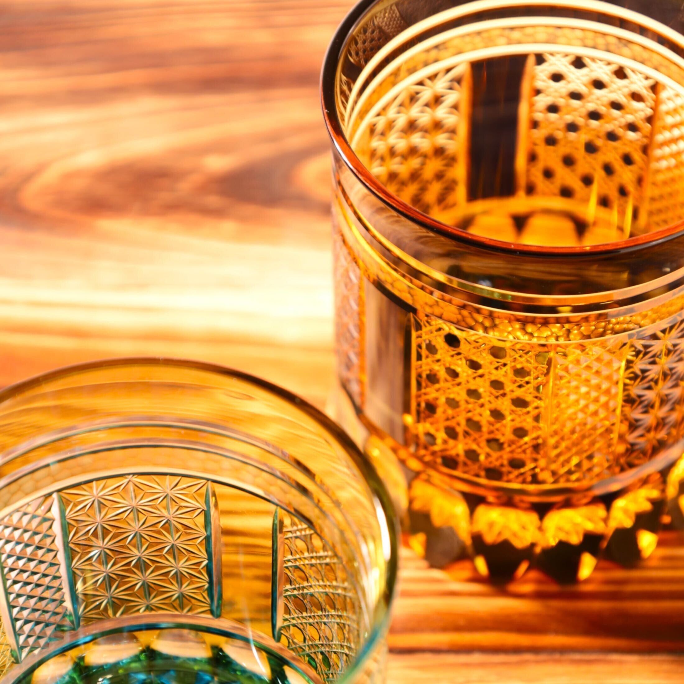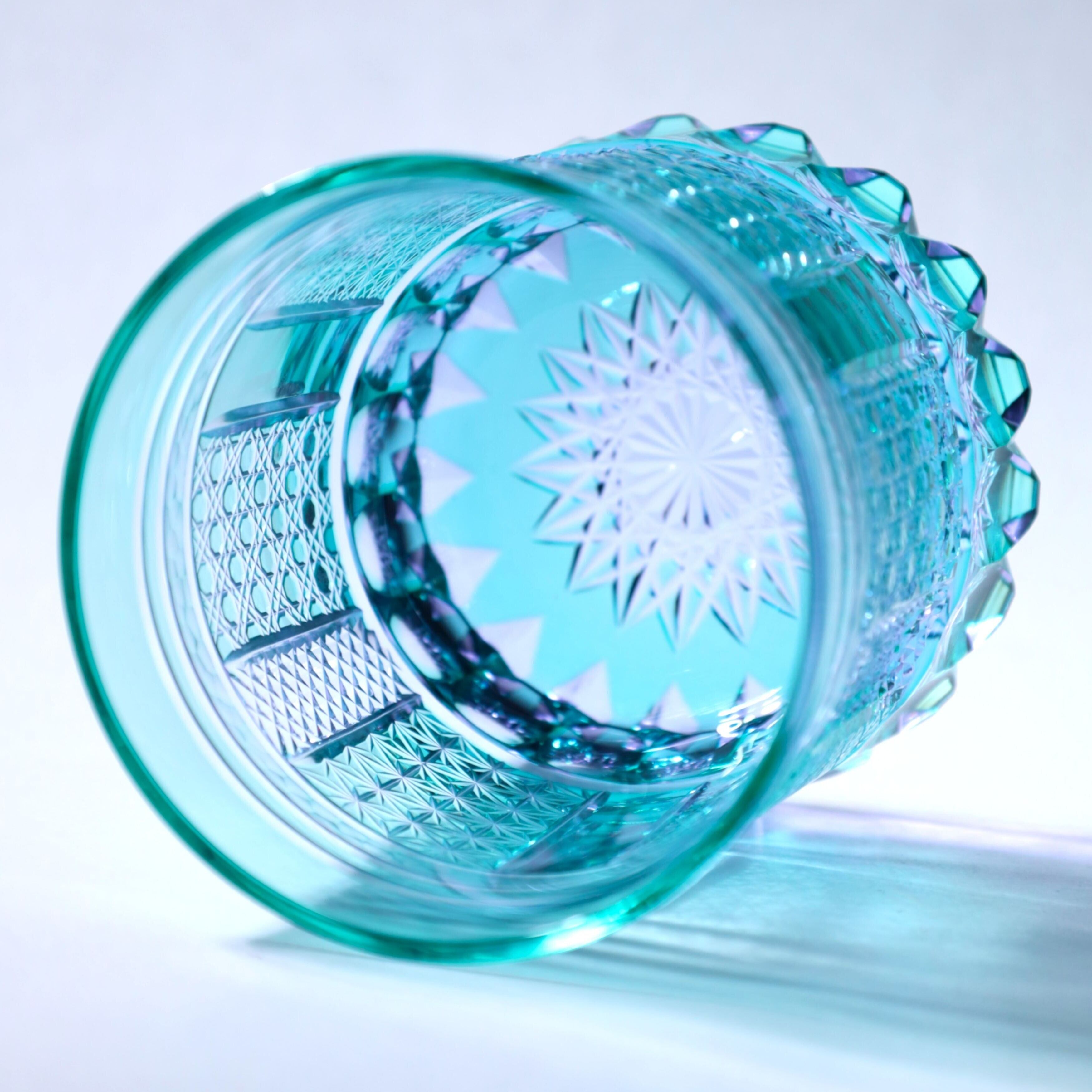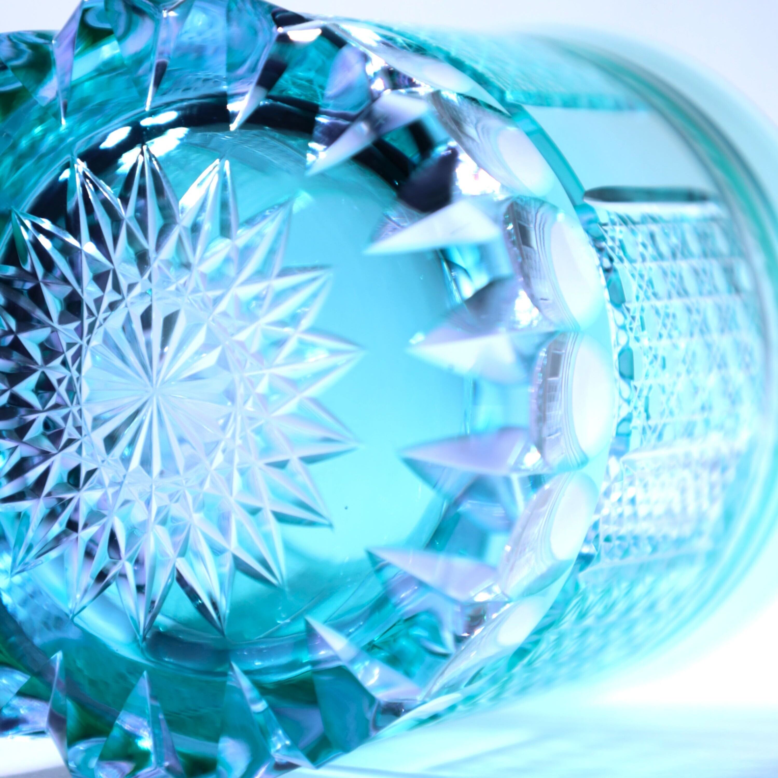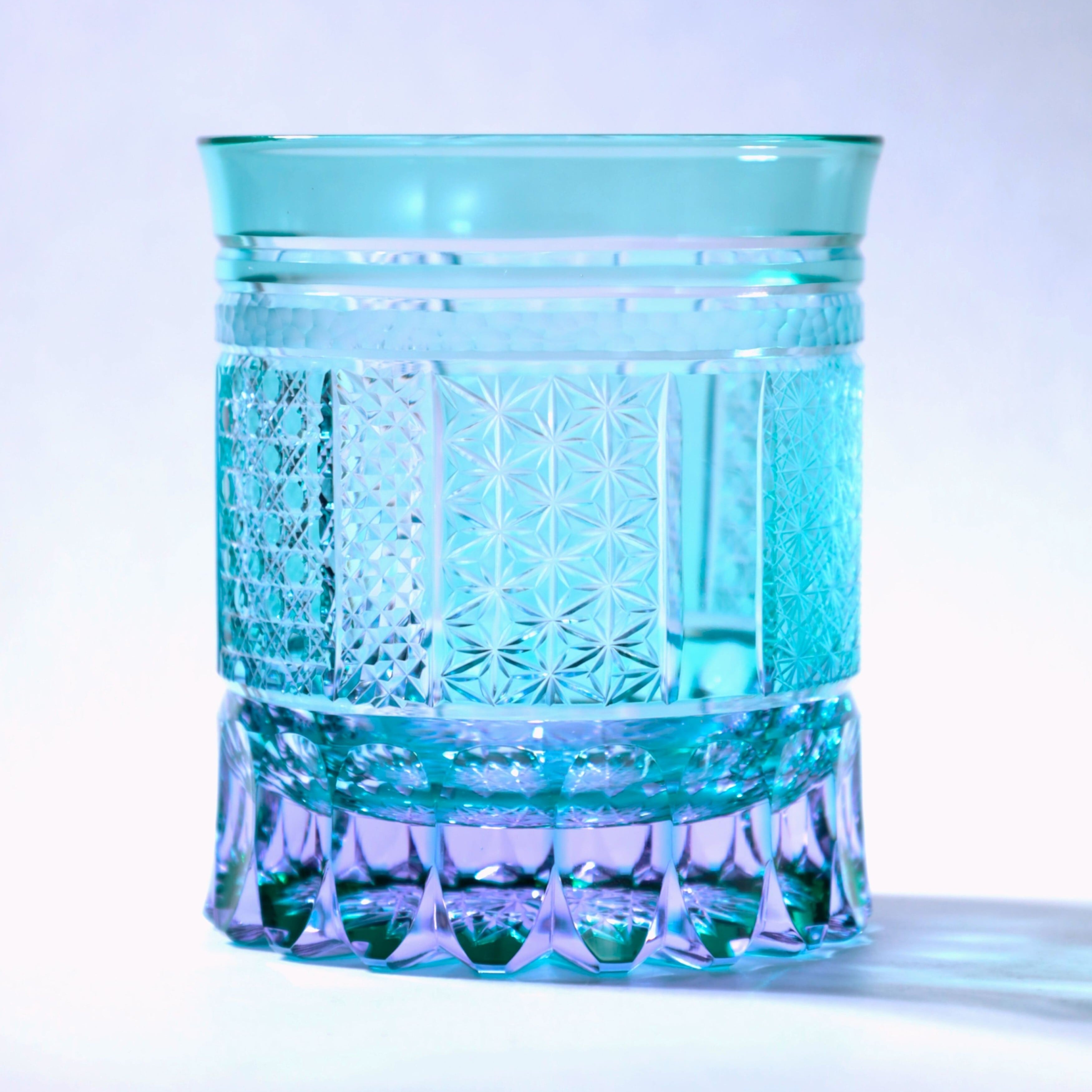 燈々無尽(とうとうむじん)とは、尽きることの無い燈火のように、お教えや想いが世代を超えて受け継がれていくーーそんな意味を持つ言葉です。明かりを灯す行燈(あんどん)をイメージしたデザインで、灯を繋ぐように、このグラスも親から子へ、世代を超えて使い続けていただきたいという願いを込めて制作しています。伝統文様「菊繋ぎ」「八角籠目」「魚子」「糸麻の葉紋」「芯あり蜘蛛の巣紋」を施し、様々な角度からグラスの表情を楽しんで頂けます。ミントとラベンダーの淡いグラデーションが、爽やかに心を癒します。