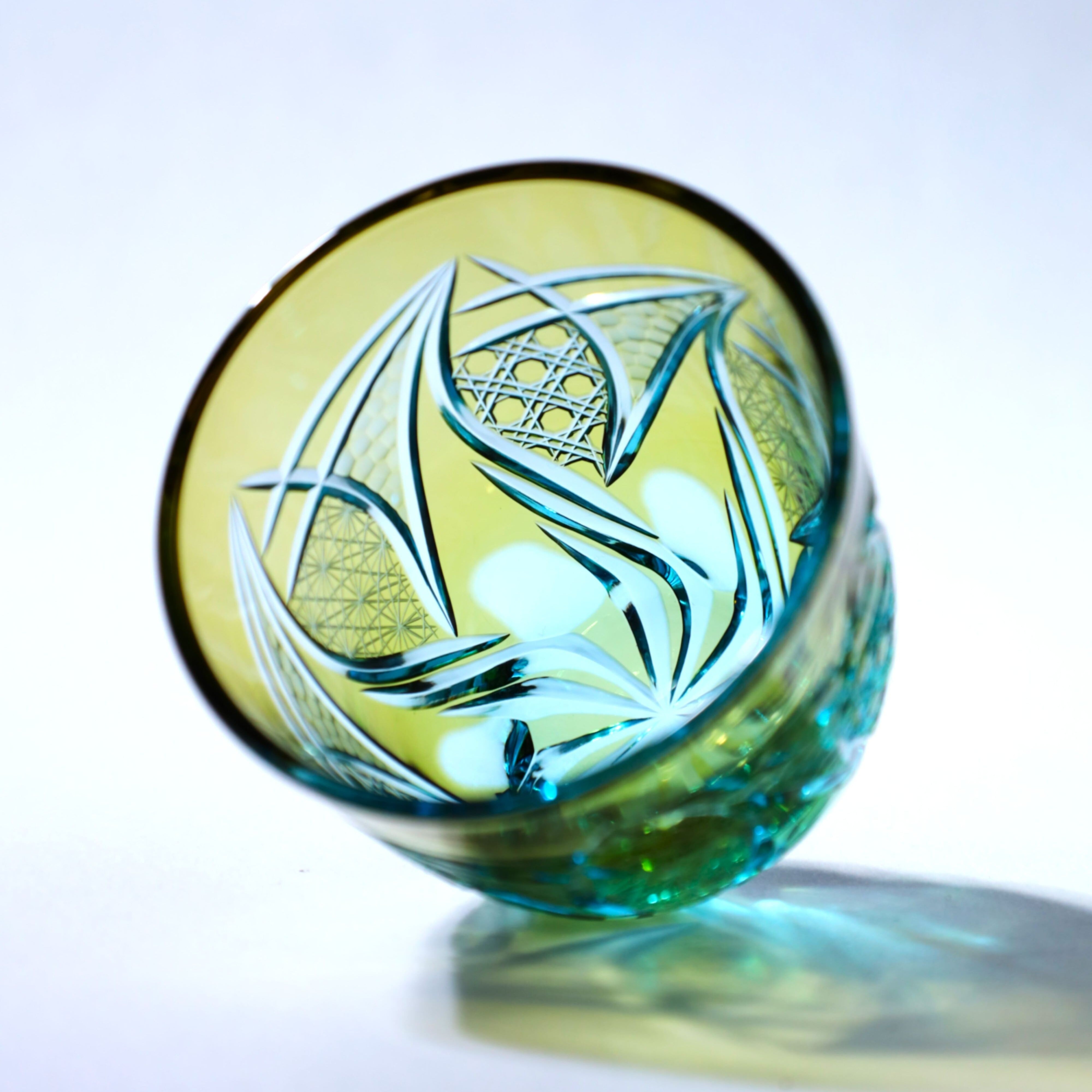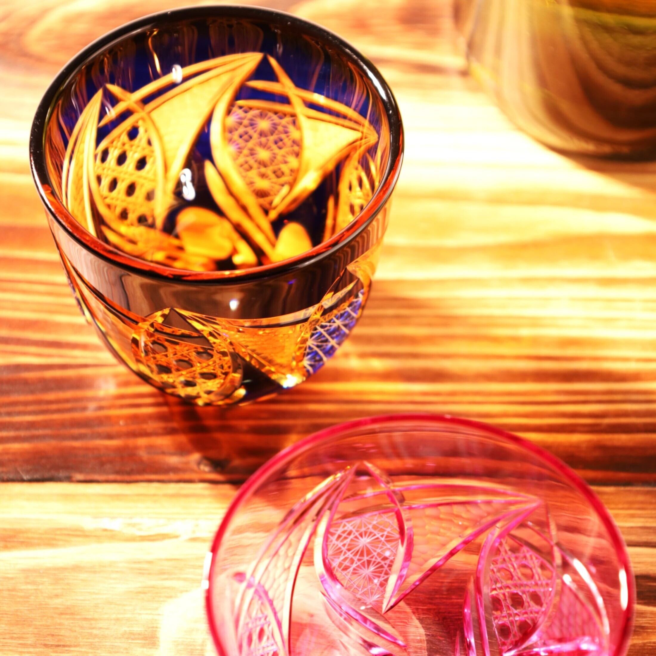 花びらが風に舞い、空を流れていく情景ーー「華嵐(はなあらし)」はその一瞬の美をガラスに刻んだ器です。嵐を思わせる流動的なカットが、風にに舞う花の躍動感を表現しています。手に取るたび、自然の息吹を感じられるグラスです。伝統文様の「菊繋ぎ」や「八角籠目」を施し、繁栄や魔除けの意味を込めています。