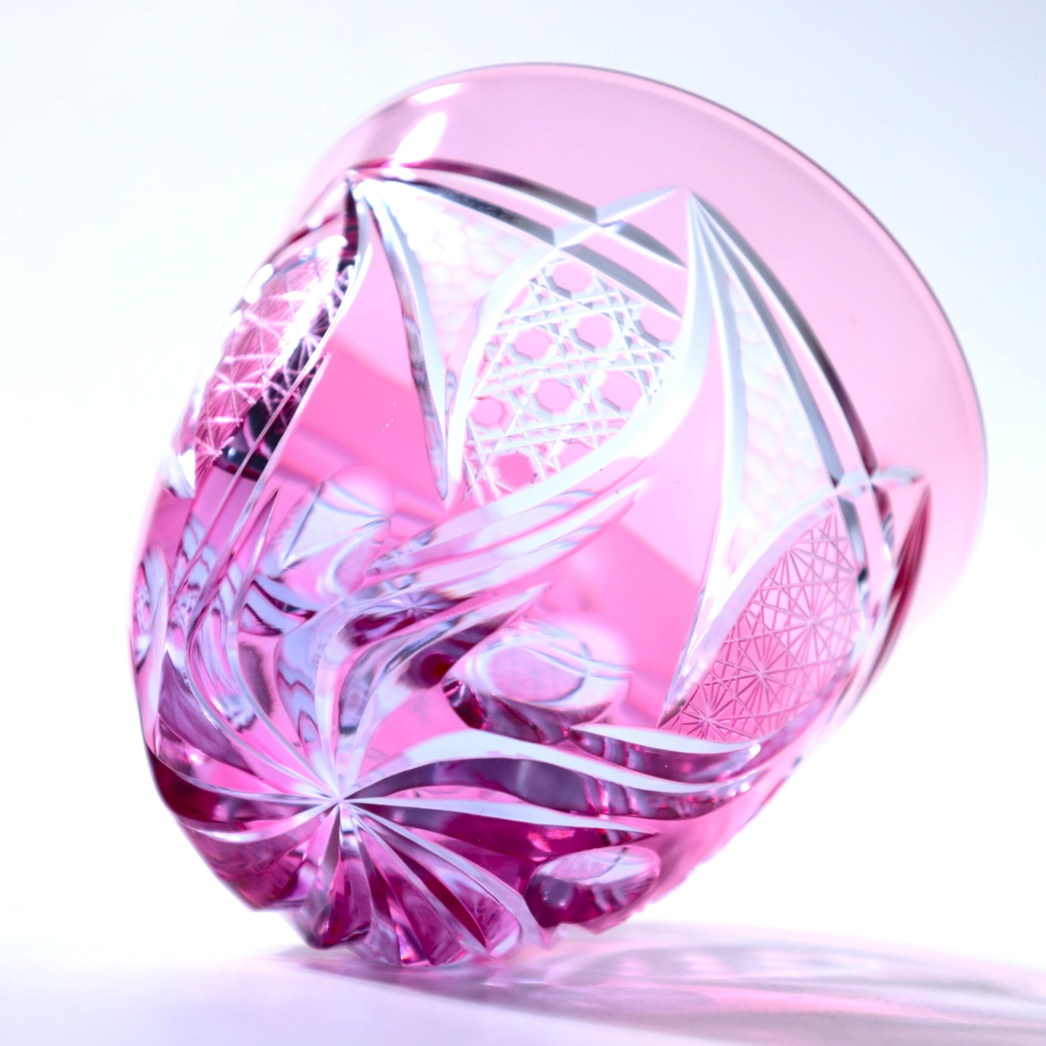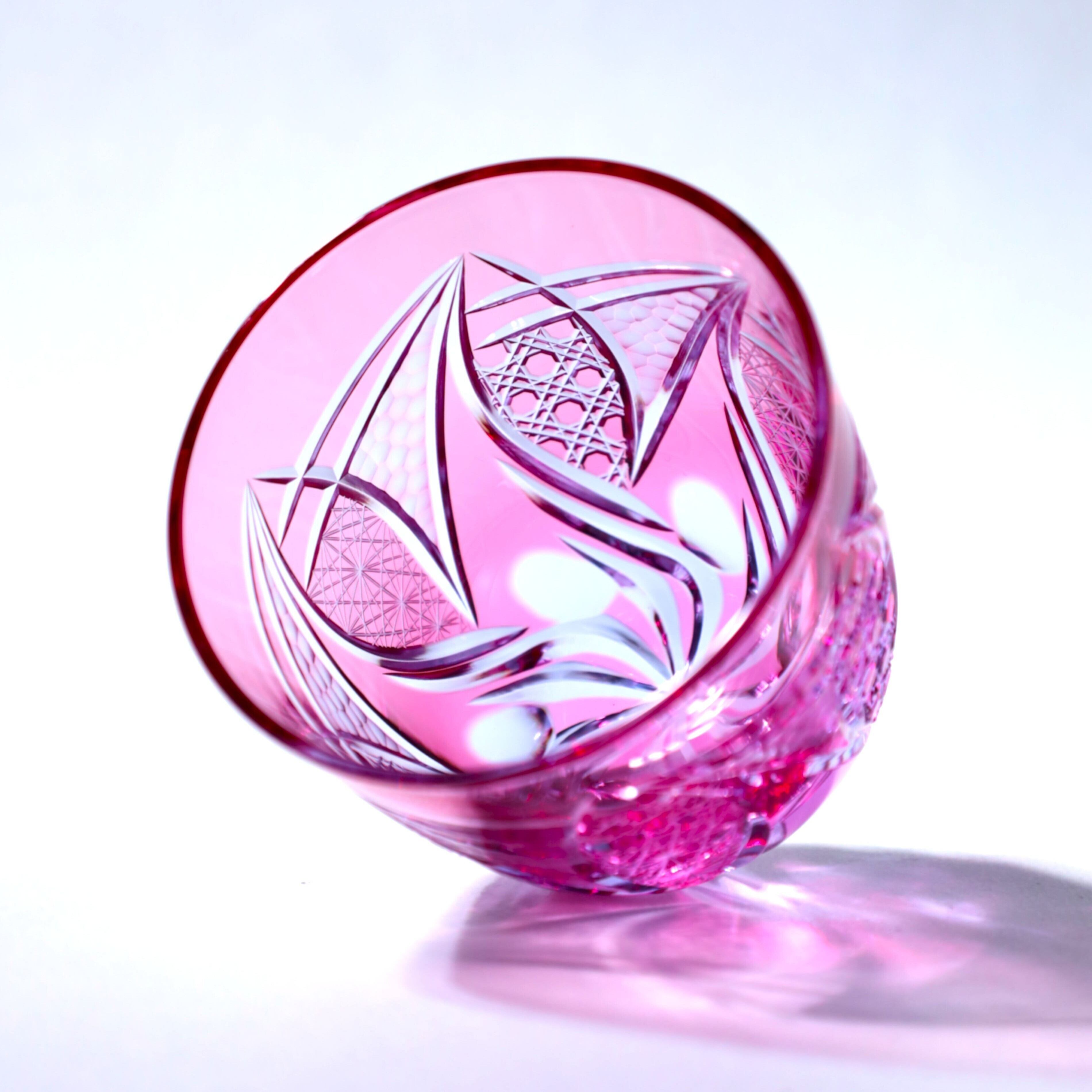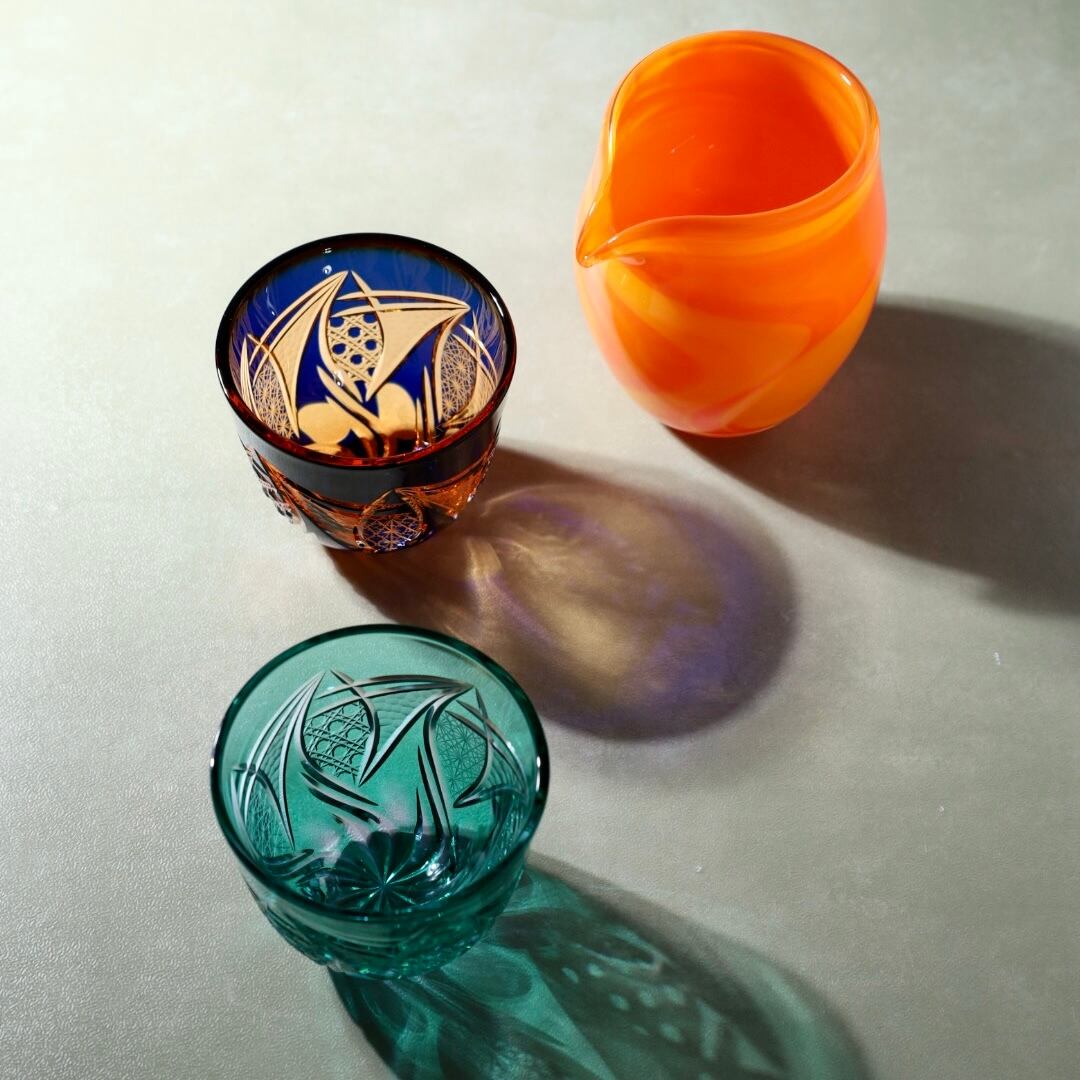 花びらが風に舞い、空を流れていく情景ーー「華嵐(はなあらし)」はその一瞬の美をガラスに刻んだ器です。嵐を思わせる流動的なカットが、風にに舞う花の躍動感を表現しています。手に取るたび、自然の息吹を感じられるグラスです。伝統文様の「菊繋ぎ」や「八角籠目」を施し、繁栄や魔除けの意味を込めています。